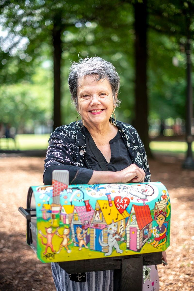"At 70, I began Krog tunnel murals. I am 70dot on Instagram. I often paint my Cabbagetown neighborhood as I imagine it was a hundred years ago, in a bright, whimsical, folk art style. My formal art training is reflected in my other art pieces. This Woodruff Park mailbox shows my love for animals and Cabbagetown."